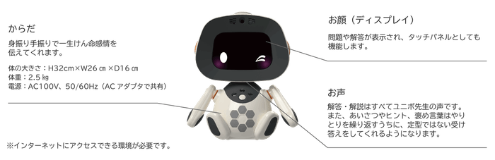 ユニボ先生は、ユニロボット株式会社(所在地:東京都渋谷区、代表取締役:酒井 拓)が開発したAIコミュニケーションロボットで、共同開発パートナーである株式会社エデュゲート(本店所在地:東京都中央区、代表:鈴木 博文)が教育現場向けにコンテンツを作成した、児童生徒の学習指導に特化したAIロボットです。