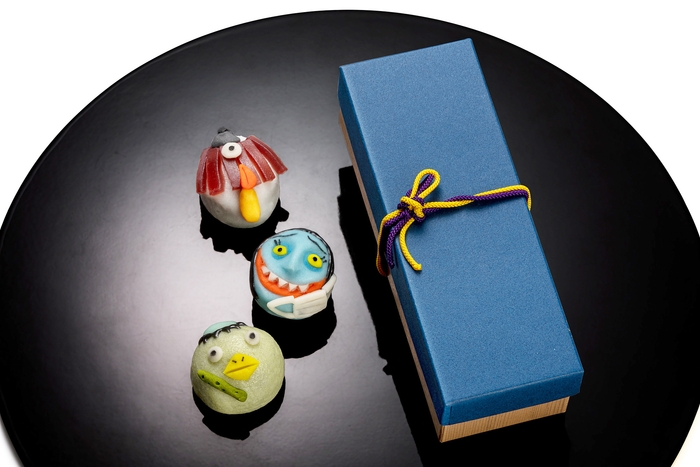 (1)「かっぱ」(抹茶ほのかに香る上用まんじゅう つぶあん入)、(2)「口裂け女」(ねりきり製 こしあん入)、(3)「から傘お化け」(求肥製 木いちごあん入)を各一個、合計三個入りで、価格は1,250円(税込)です。