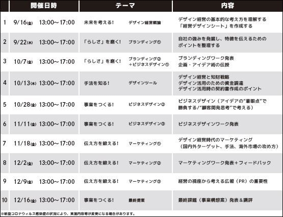 ●全10回の講義とワークを通して、「デザイン経営」を体験できるようプログラムされています。課題のための自主活動(事業所訪問・個別ミーティング等)も推奨しています。