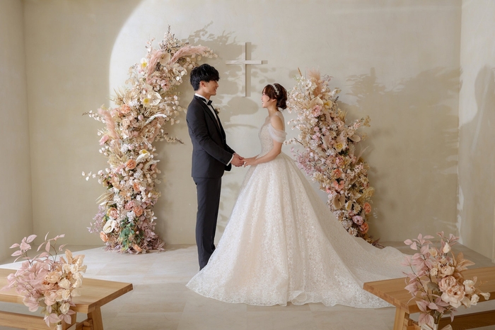 “花のチャペル”スタジオ内にはお花に囲まれたチャペルのほか、お花を使った複数の背景をご用意しており、バリエーション豊富な撮影が叶います。