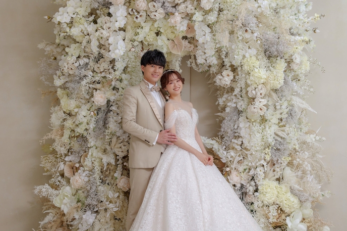 オフホワイトのお花をたっぷりと使用し、おふたりの姿をより華やかに映し出します。