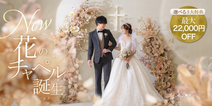 今回のリニューアルに合わせて、最大22,000円OFF等の豪華特典もご用意しています。スタジオエイトの“花のチャペル”で、おふたりらしい最高の1枚を撮影しませんか。