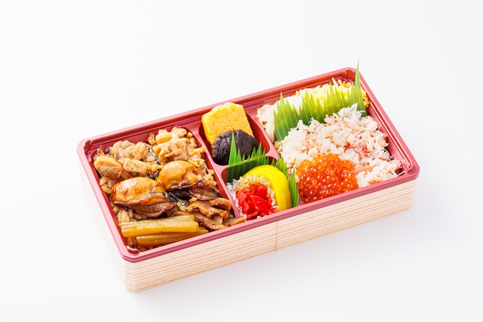 牡蠣の煮汁とひじきで炊き上げたご飯に、山海の幸を盛り付けた旨みぎっしりのお弁当。