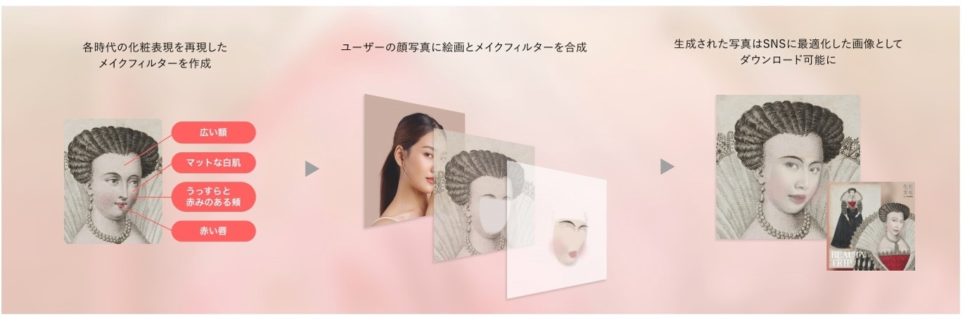 撮影からなりきりメークまで、アプリで生成された画像は美しい背景と共にご自身のデバイスに取りこみSNSでシェアできるなど、化粧文化をもっと身近なものにするための楽しい仕掛けも盛り込まれています。