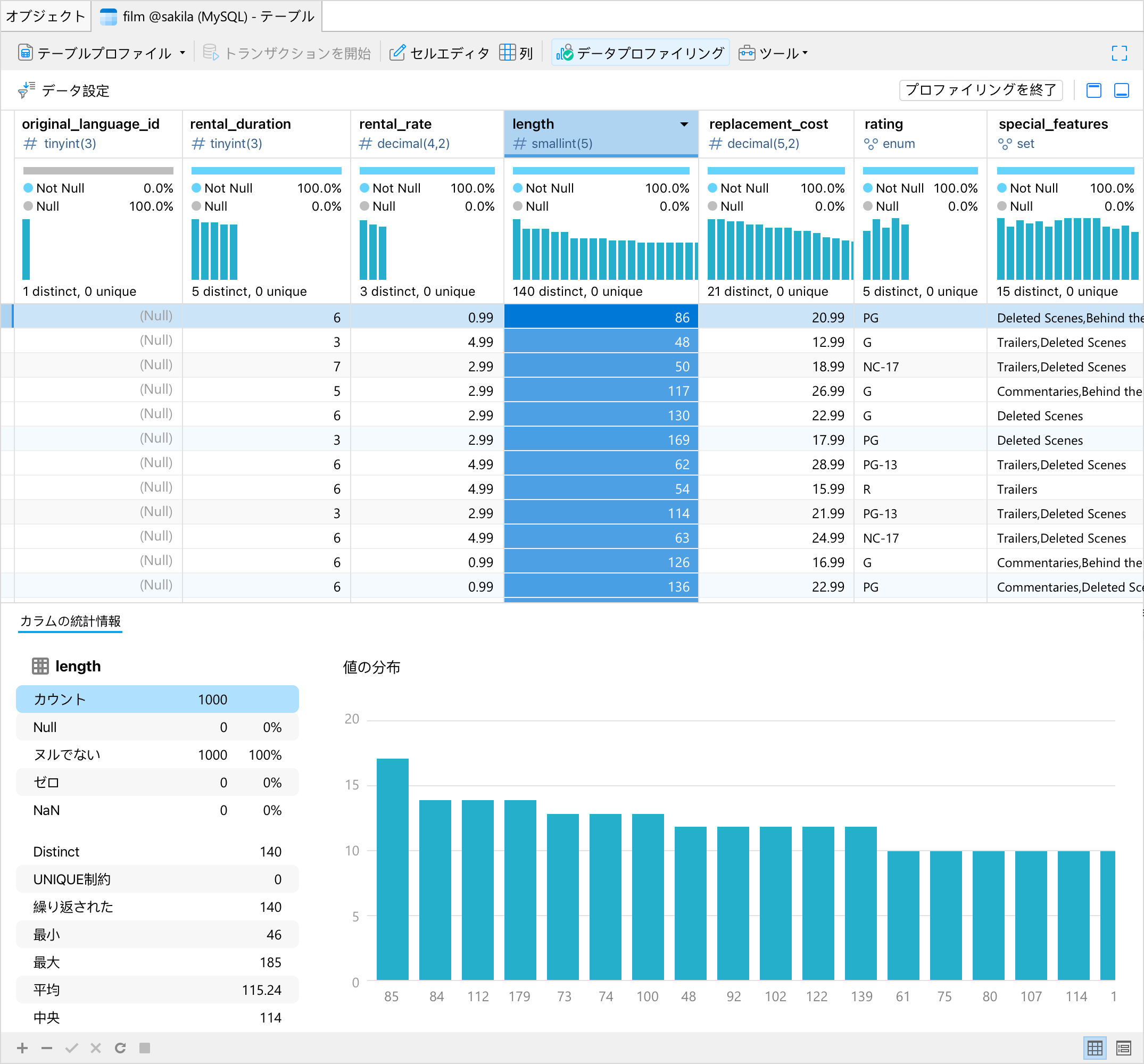 ●データプロファイリング:Navicat 17のデータビューアにはデータ・プロファイリング・ツールが統合されており、データの視覚的かつ包括的なビューをユーザに提供します。この機能により、ユーザは役立つインサイトを得て、データ分析に基づいた決定を提供できます。