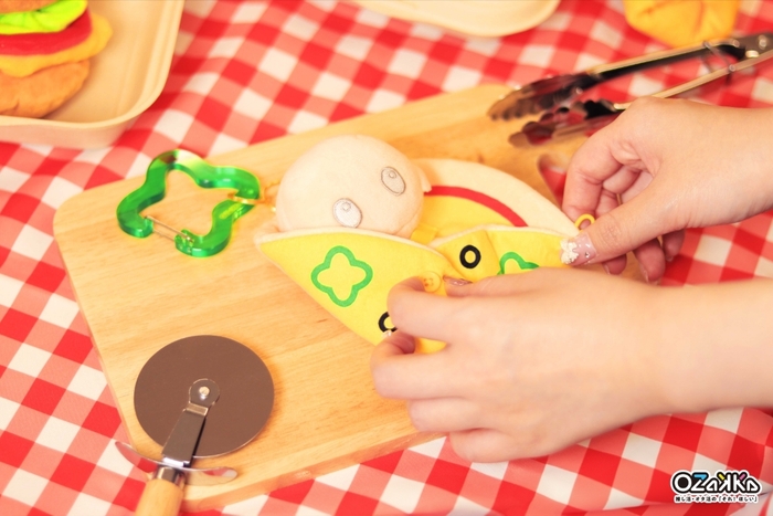 さらにマジックテープで足元を押さえてぬいぐるみの体を固定することで、ぬいぐるみが飛び出しにくくなっています。