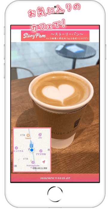 ソーシャルメディア(SNS)で多く使われている「24時間で消える投稿」ストーリーズ投稿に「今いる場所を簡単にシェア」できるようスマートフォンのカメラ映像に地図を添えて撮影できるアプリです。