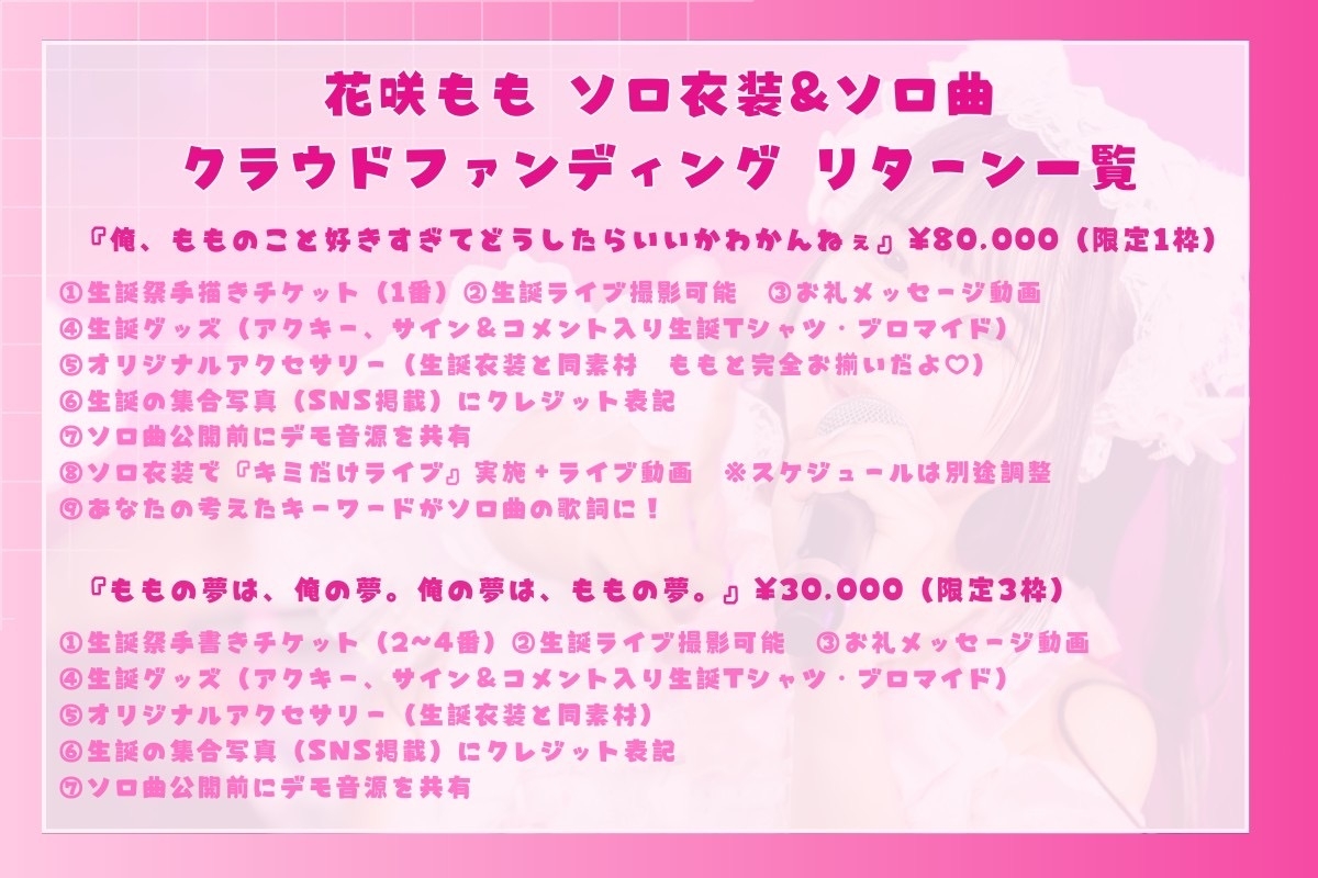 『アイドルとして初めて迎える生誕イベントを、大好きなピンク色(担当カラー)に染めたい』という、メンバー・花咲ももの夢を叶える上で『ソロ衣装&ソロ曲があればイベントが更に盛り上がり、会場に一体感も生まれる』と考え、プロジェクトゴールを設定いたしました。
