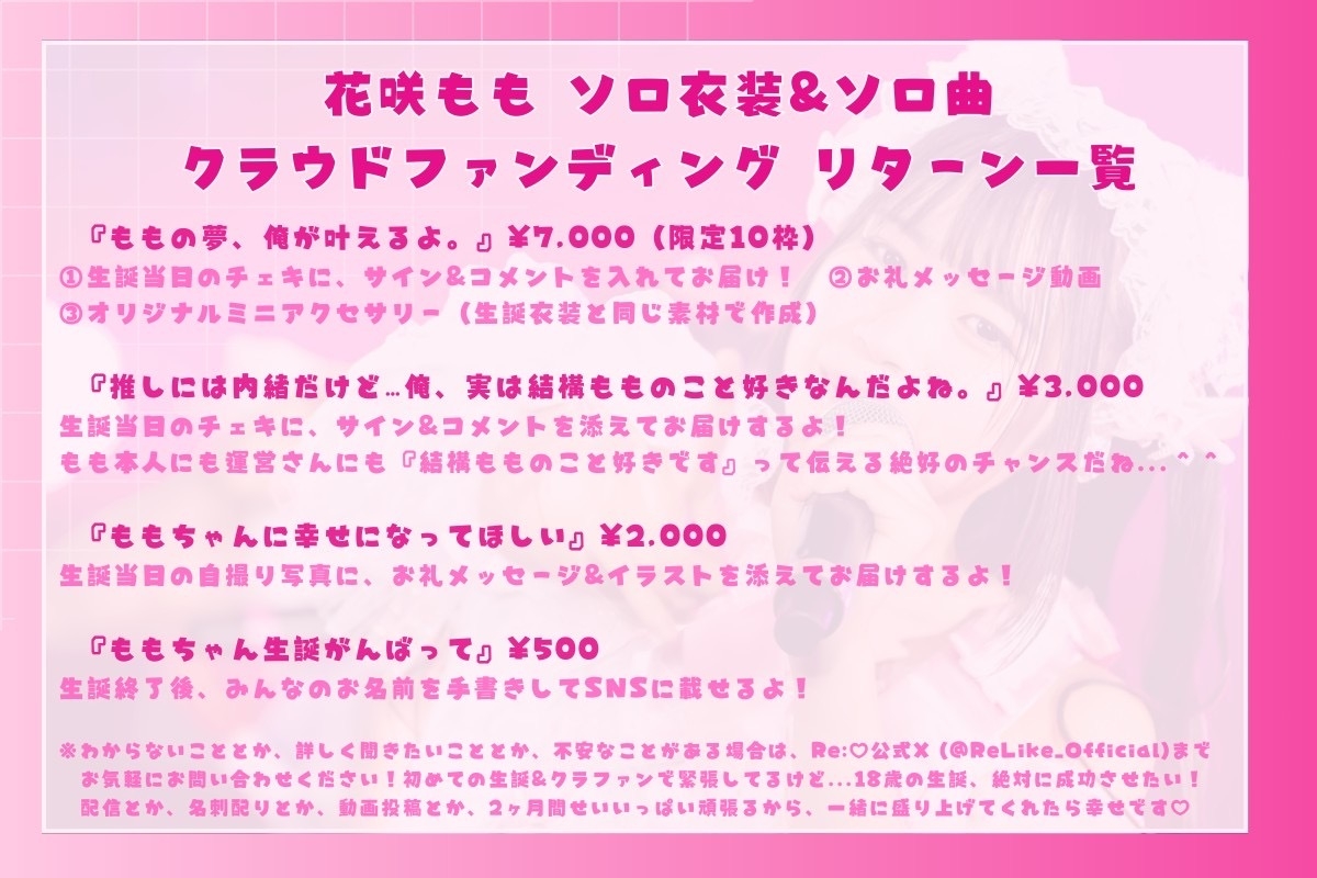 アイドルグループ Re:♡【りらいく】メンバー・花咲もも 生誕クラウドファンディングにて目標金額168%を達成 ~デビュー半年でソロ衣装&ソロ楽曲を制作~