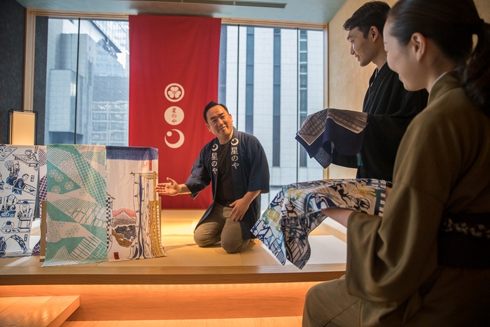 「お江戸・文化の宴」は、日によって異なる老舗が星のや東京に集まり、店主や職人との対面でのやり取りを通して、店の文化や伝統に触れられる催しです。創業に至った経緯や歴史、代々引き継がれてきたこだわりを対面で伝えるために、2階にあるパブリックスペースに屋台や展示スペースなど特別な設えを施します。お店の文化や伝統を聞きながら、こだわりの料理を食べ、工芸に触れることで、お店でも体験することのできない「お江戸・文化の宴」ならではの楽しみ方ができます。