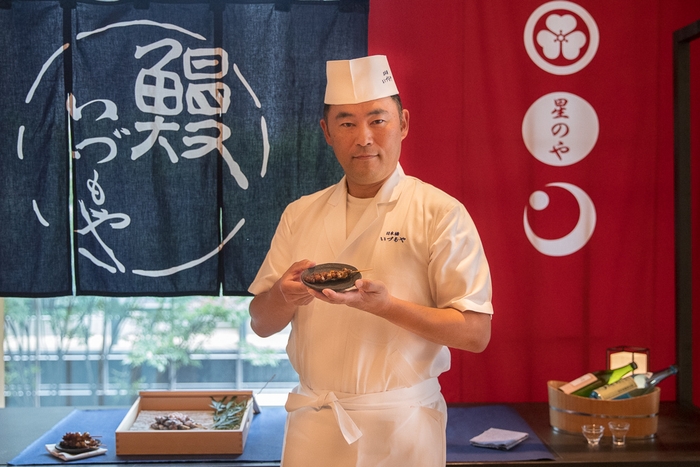 日本橋本石町にお店を構える「いづもや」は、三代続く鰻の名店です。鰻は元々「江戸前」の語源になったほど、江戸の人々に親しまれた食材で、今でも多くの人々に食べられています。この催しでは、鰻を串に巻きつけた「くりから焼き」を提供します。魚本来の味を生かした「くりから焼き」は、店舗でも提供していない特別なメニューです。熟練の職人が鰻や商いに対するこだわりをお伝えします。