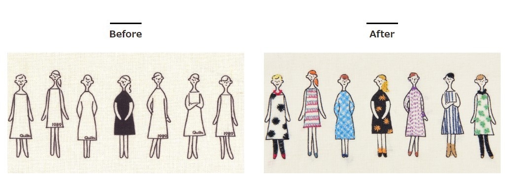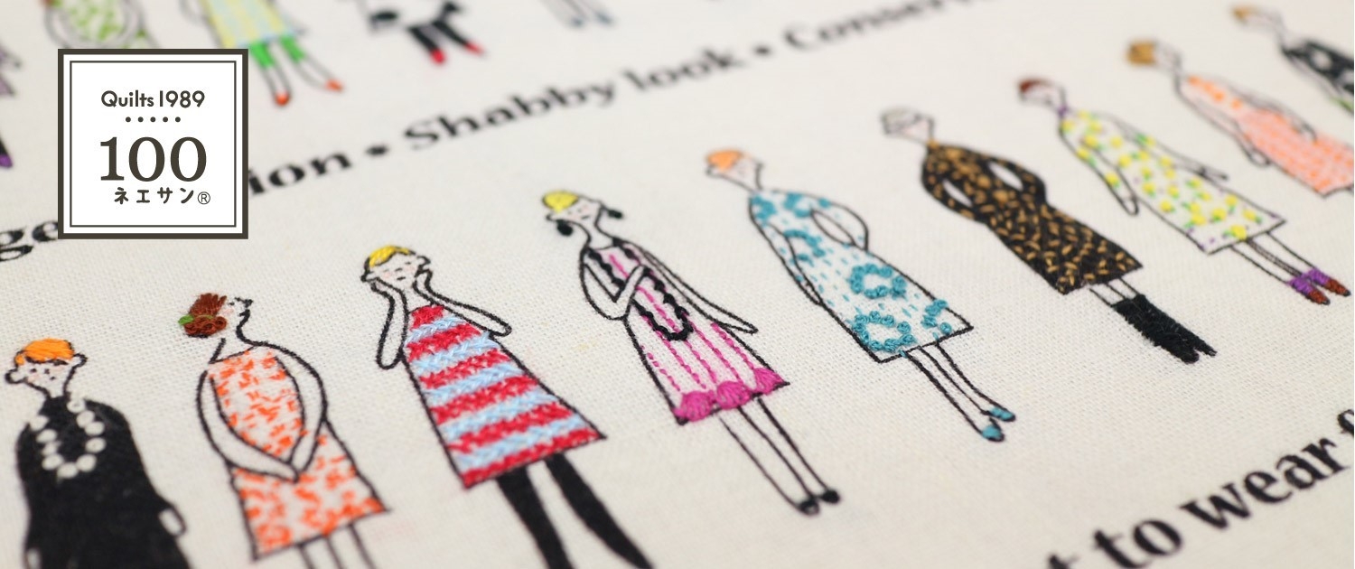 手芸作家 中島 一恵が手掛ける「100人100様のものづくり」をコンセプトとした『刺しゅうやペンでスタイリングできるぬりえみたいなファブリック』。作り手がそれぞれに、布上に登場する「ネエサン」の個性をひきだし、ストーリー性のあるもの作りができるのが特長。楽しみ方は自由自在。着せ替え気分で、ひとりひとりのネエサンの髪型や服、足元をスタイリングすれば、オリジナル作品ができあがります。