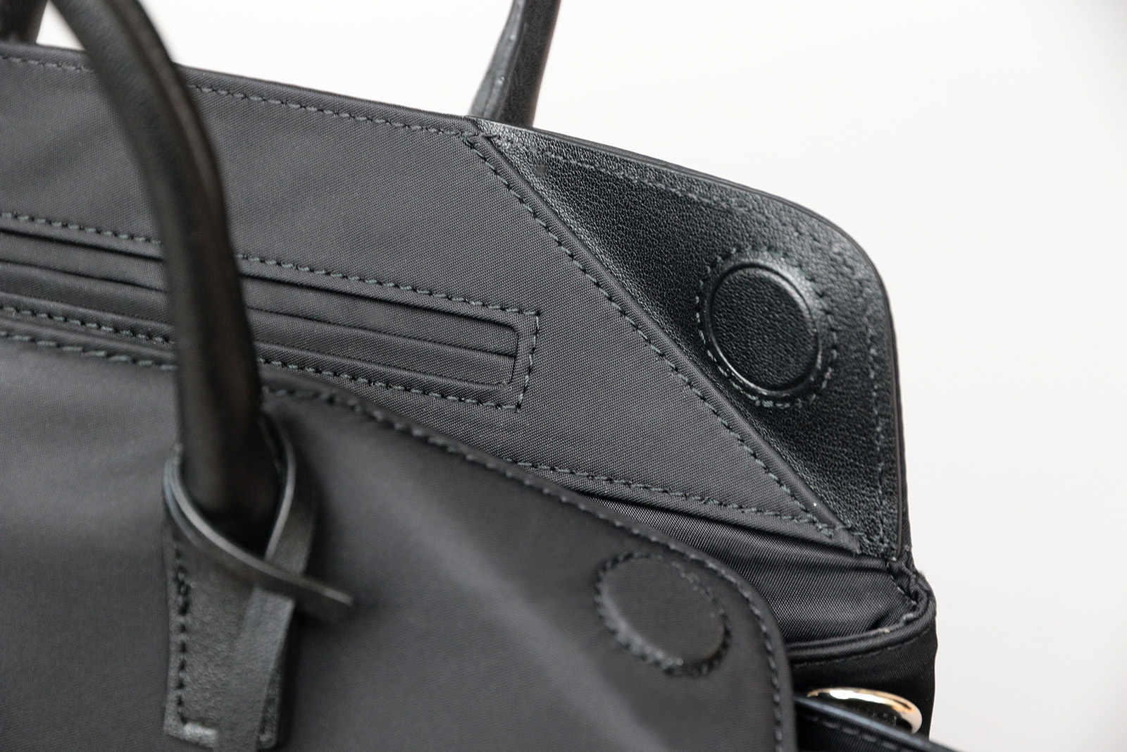 Flipper attivaはナイロン生地の内側に、密度が高く復元力のある芯材を内蔵しています。ナイロン素材特有の軽さを実現しつつ、かつ美しく本体の形状を保つ構造となっています。約700g程度の重さです。(部分的に天然皮革を使用しているため、重量には多少の個体差があります)