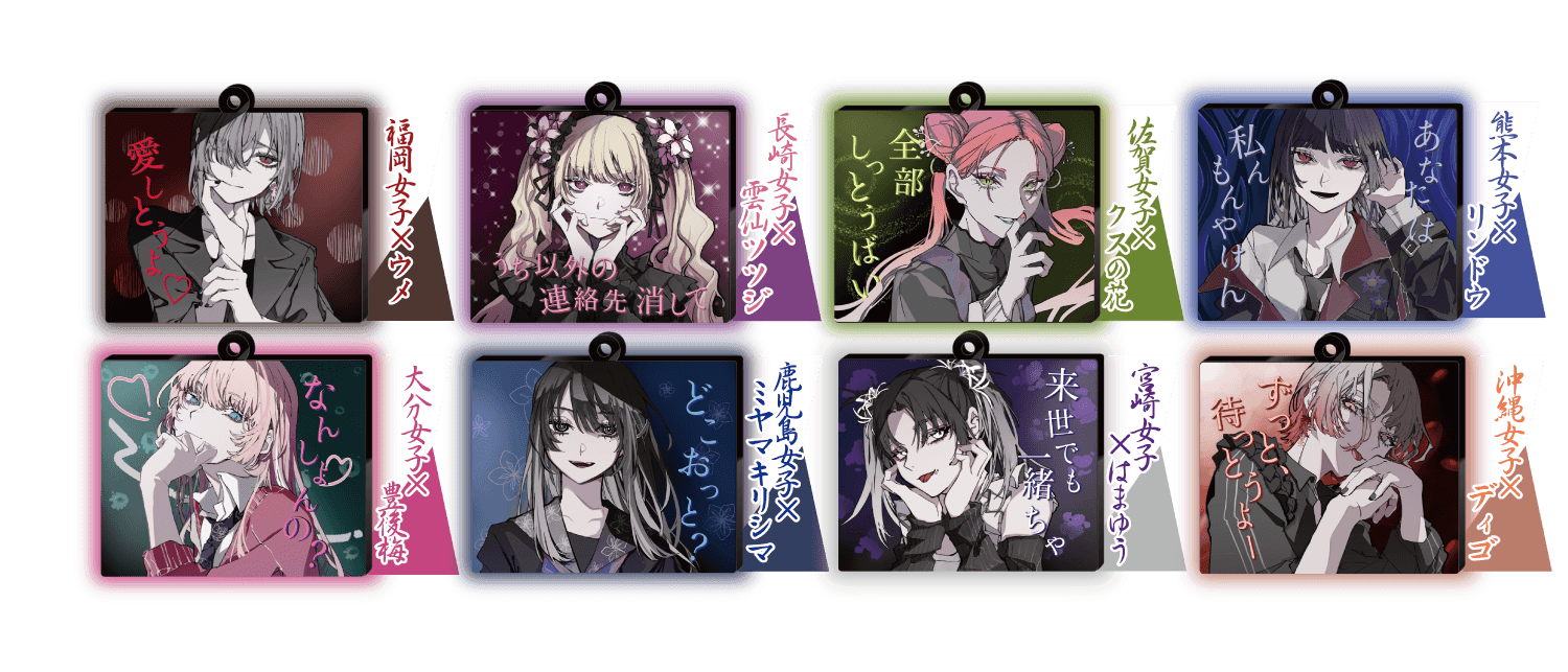 実はユーザー様より一番多くお声を頂いており、今回満を持しての発売決定。かわいい方言ランキング1位の福岡博多弁から沖縄まで全8種!Adoのイメージディレクターをはじめ、数々のアーティストのMVイラストやキャラデザなどを手掛けているイラストレーターORIHARAが描き下ろした九州女子のアクリルキーホルダーを発売いたします!