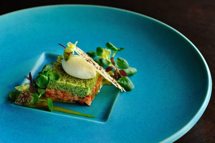 良質な肉に育った仔山羊を、フレンチ技法を用いて昇華させた「シェーブルのクスクスサラダ仕立て パッションの香り」。低温調理した仔山羊のタルタルの上に、フーチバーを混ぜ込んだクスクスを合わせた一品です。ゆっくりと火入れした仔山羊は柔らかくも弾力があり、他の肉にはない食感です。仔山羊は柔らかい新芽を好んで食べるため、春に芽吹く若草をよく食べ、栄養を蓄えます。臭みが少なく食べやすい仔山羊を、濃厚なシェーブルチーズのクリームや南国の甘酸っぱいパッションフルーツソースと合わせました。仔山羊の旨味と、スパイスやソースのアクセントが混ざり合う複雑な味わいに、誰もが驚く逸品です。