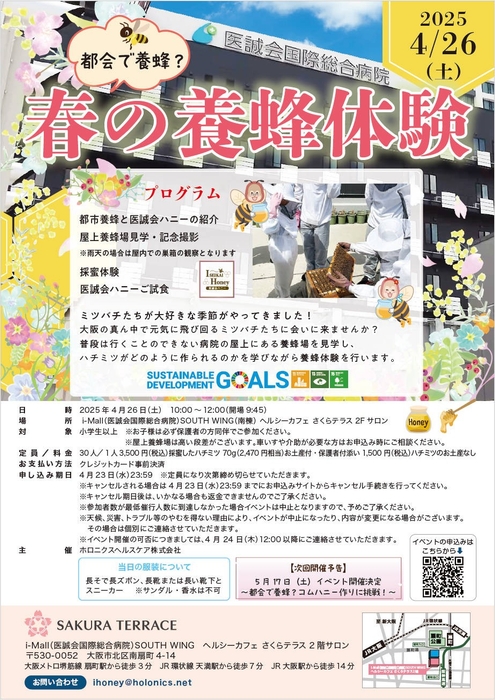 医療法人医誠会(本社:大阪市、代表者:谷 幸治)は、2025年4月26日(土曜日)10:00より、医療複合施設「i-Mall」内のヘルシーカフェ「さくらテラス」で都市養蜂の魅力を体感できるイベント「都会で養蜂?春の養蜂体験」を開催します。
