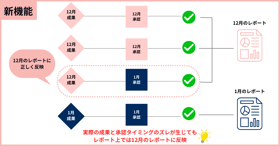 次月以降に承認された成果であっても、成果月に基づいたレポートを出力できる機能