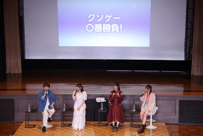 振り返りの後に始まったのは、今回のイベントのメインコーナー「クソゲー〇番勝負!」。キャストは内田さん&和氣さんの「同級生チーム」、日笠さん&小市さんの「ゲーム仲間チーム」の2チームに分かれて様々なクソゲーで競い合い、会場のファンは各ゲームでどちらのチームが勝利するかを予想し特設ページに投票をしていきます。そして最終的に正答率が最も高かった人たちに、イベントの最後に行われる「じゃんけん大会」への参加資格が与えられることが発表されました。