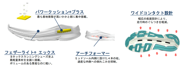 「CARBON CRUISE GLIDER」は、走行安定性の高いフラット形状の「3Dパワーカーボン」を搭載。さらに、軽量ながら衝撃吸収性、安定性の高い厚底クッションを採用し、ミッドソール内側に設けた4本の柱(アーチフォーマー)の周囲には、ヨネックスランニングシューズ史上最軽量素材であるフェザーバウンスフォームを搭載。内側への倒れ込みをさらに抑制し、長距離走行をより快適にサポートします。また、底面には優れた耐摩耗性を持つエンデュランスラバーを使用しています。