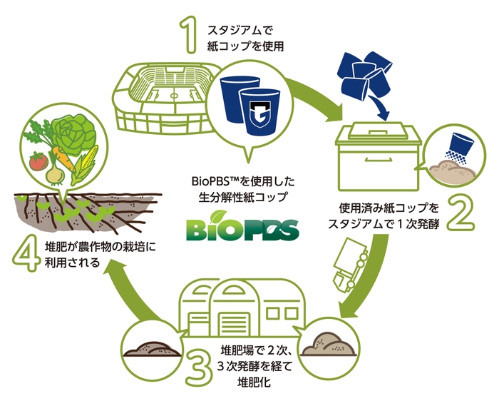 使用された紙コップは、スタジアムに設置された食品残渣発酵分解装置で食品残渣物などと一緒に1次発酵を行います。1次発酵物は、堆肥場にて2次、3次発酵を行ったのち、農作物の栽培に利用できる堆肥に生まれ変わります。2022年のシーズンを通して、このような紙コップを起点とした循環型システムの実証実験を行います。
