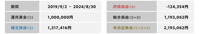 特設ページには、『トラリピ戦略リスト』で提案している「NOK/SEK Half&Half戦略」を2019年9月~2024年8月の5年間で運用した場合のバックテスト結果を掲載しております。
