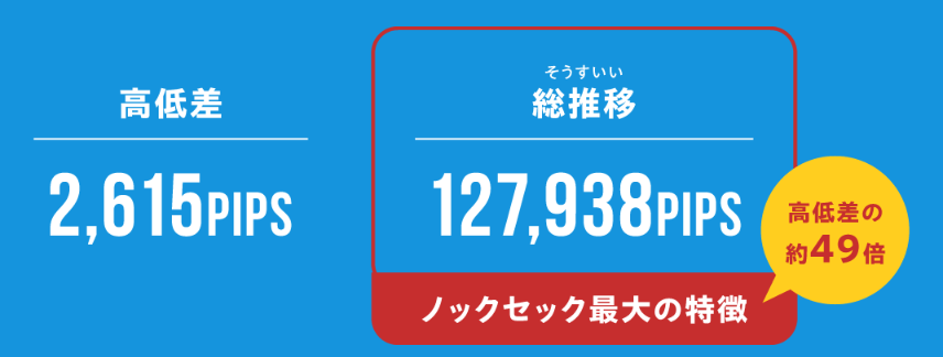 「総推移」とは、期間中に、「トータルの値動き」がどれくらいあったのかを示すデータです。一定期間の日脚の高低差(高値ー安値)の合計で算出しますが、その「総推移」が多いということはリピートしやすい、すなわちトラリピ向きの通貨であるということになります。