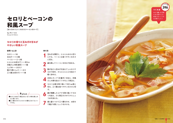 料理レシピ投稿サイト”クックパッド”の膨大なレシピのなかから、「スープ」をテーマに厳選したレシピを収録しました。主菜に合わせたいあっさりシンプルなものや、一品で満足のボリュームたっぷりなおかずスープまで幅広く紹介しています。