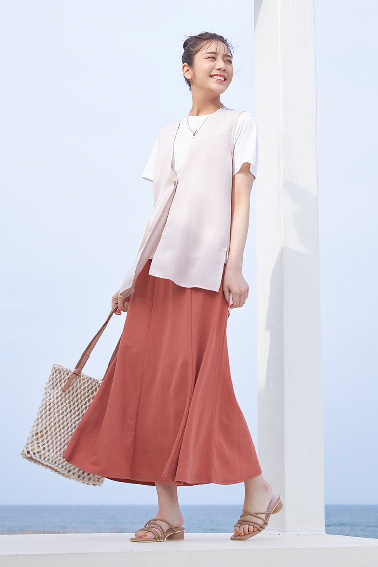 遮熱、接触冷感、UVカット機能などを兼ね備えたTシャツはカラーとバリエーションも豊富で夏の必須アイテム。様々なコーディネートで女性らしく軽やかに着こなしています。