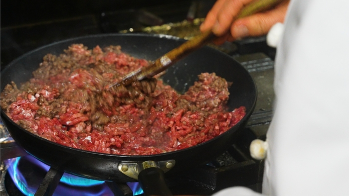 2021年にコロナ禍を受けて個人向けに開発した「みやぎパスタ紀行」と名付けたパスタソースのシリーズの中で、レトルトパウチの製造法に最も適した「仙台牛のボロネーゼ」を、これまでの1食分150gから容量を変更し外箱を省略した形で業務用の体裁にしました。味にこだわり、製造工程においてもレストランの厨房と同様のレシピで100%仙台牛を使用し、1食分と多人数分の容量を用途に合わせて使い分けることができ、容易に高品質なメニューの提供が可能です。