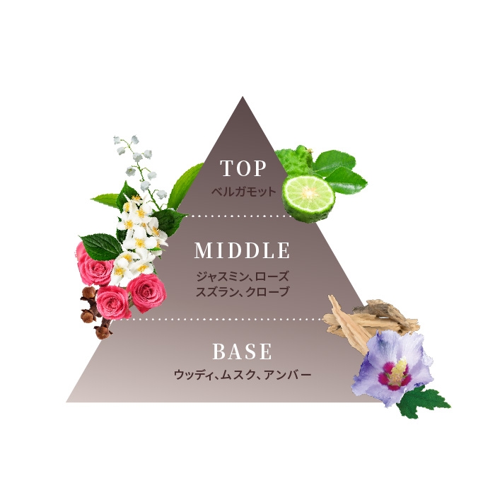 柔らかで優雅なウッディに、華やかなローズと清潔感のあるスズランをブレンド。