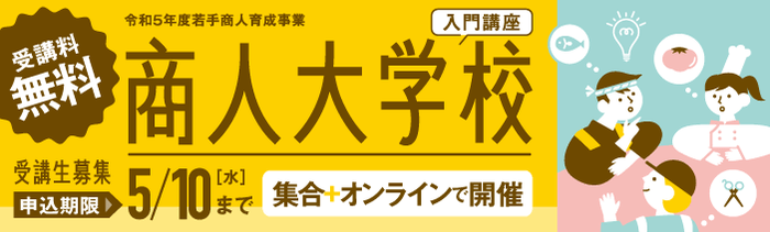 東京都及び公益財団法人東京都中小企業振興公社では、経営意欲あふれる飲食店、小売店、サービス業の経営者、後継者、従業員、開業予定者の方を対象に「商人大学校・入門講座」を開講いたします。集合講座4回+オンライン講座4テーマにて、お店の経営に役立つ知識を提供いたします。3年ぶりの実施となる集合講座は、秋葉原駅より徒歩約5分の「AP秋葉原」が会場となります。グループディスカッション等を盛り込んだ参加型の講義で、様々な業種の受講生との交流の場としてもご活用いただけます。