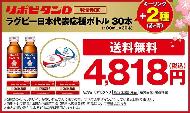 また、「リポビタンD ラグビー日本代表応援ボトル」を販売する当社オンラインショップの大正製薬ダイレクトでは、「リポビタンD ラグビー日本代表応援ボトル」を30本セットでご購入の方にオリジナルキーリング2種(赤・青)をプレゼントいたします(キーリングは数に限りがございます)。