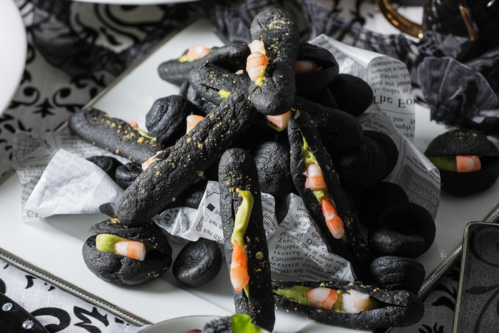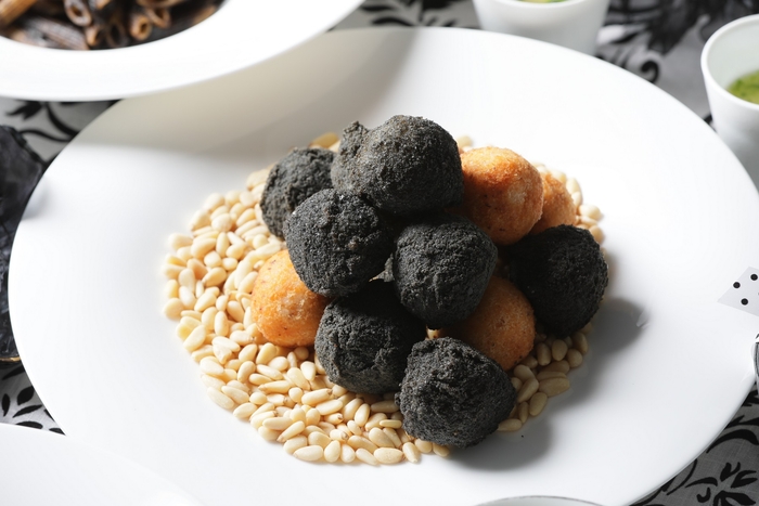 茸のポタージュ カプチーノ仕立て / 鶏むね肉のブラックベニエ / 柔らかく煮込んだ牛ボロネーゼとビーツのキッシュ / 真っ黒なポテトフライ / 黒豆乳の茶碗蒸し / イカ墨とシーフードパスタ /竹炭パン粉のアランチーニ / 豚肉のコンフィーと根菜のフリット