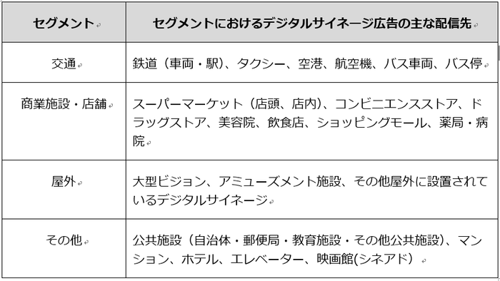 本調査では、デジタルサイネージ広告を、交通機関/商業施設・店舗/屋外(OOH)/その他の4つに分類し、2020年の推計と、2024年までの予測を行った