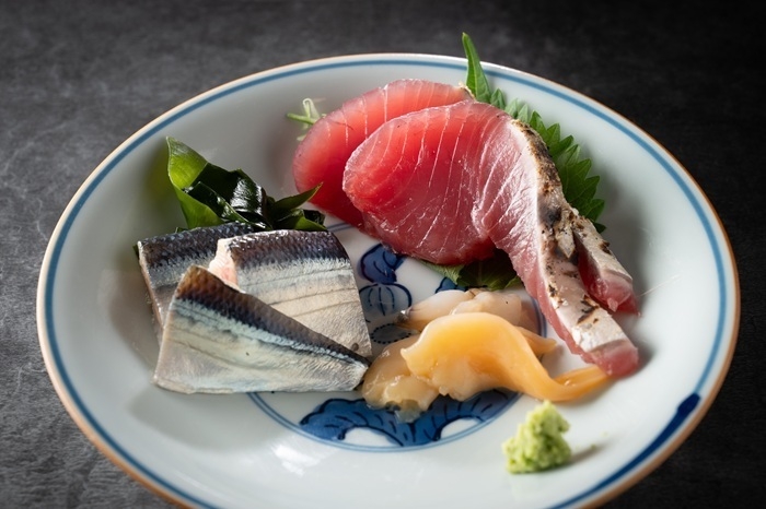 ・刺身三点盛 :本店仕込みの江戸前の仕事が施されたかつお、青柳、秋刀魚