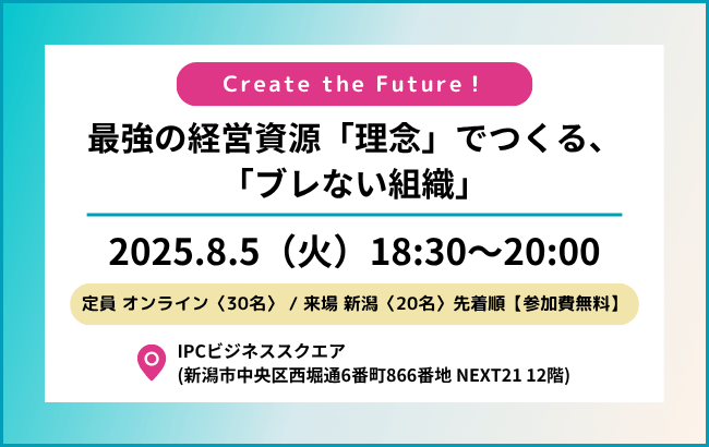 みらいコンサルティンググループ(本社:東京都中央区、代表:久保 光雄 岡⽥ 烈司)は、2025年8月5日にセミナー『最強の経営資源「理念」でつくる、「ブレない組織」』を新潟会場とオンラインにて同時開催します。