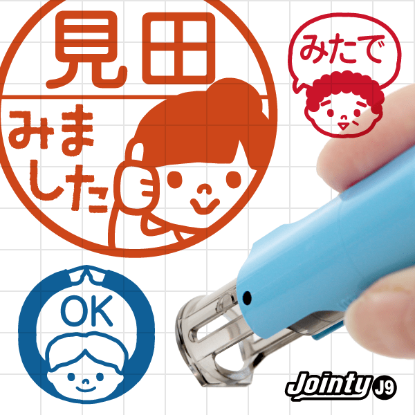 キャップレスで軽い押し心地の回転式ネーム印「Jointy J9」を採用。浸透印ではなくゴム印タイプのため、 イラストの細かい部分も鮮明に表現できます。持ち歩きしやすい工夫がされており、スタンプ台内蔵で連続押印してもかすれません。