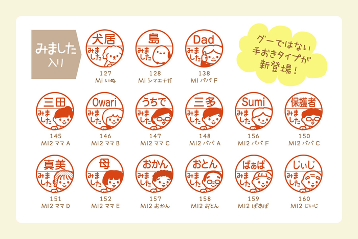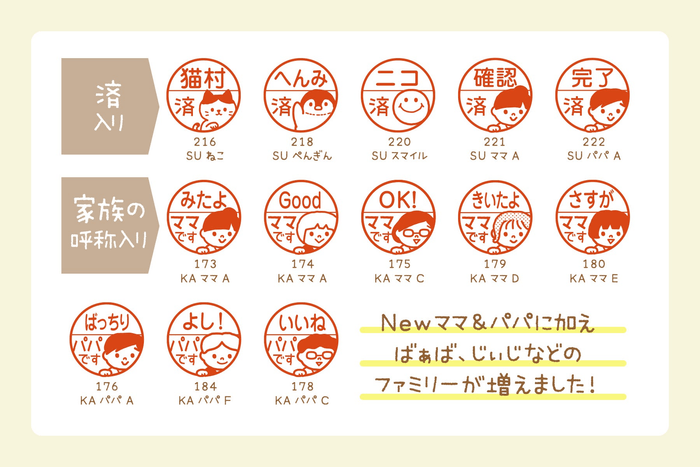 「みました」「OKです」「済」「ママです」「パパです」の文字がデフォルトで入ったデザインをご用意しました。お名前を入れることができるため、さまざまなシーンでお使いいただけます。
