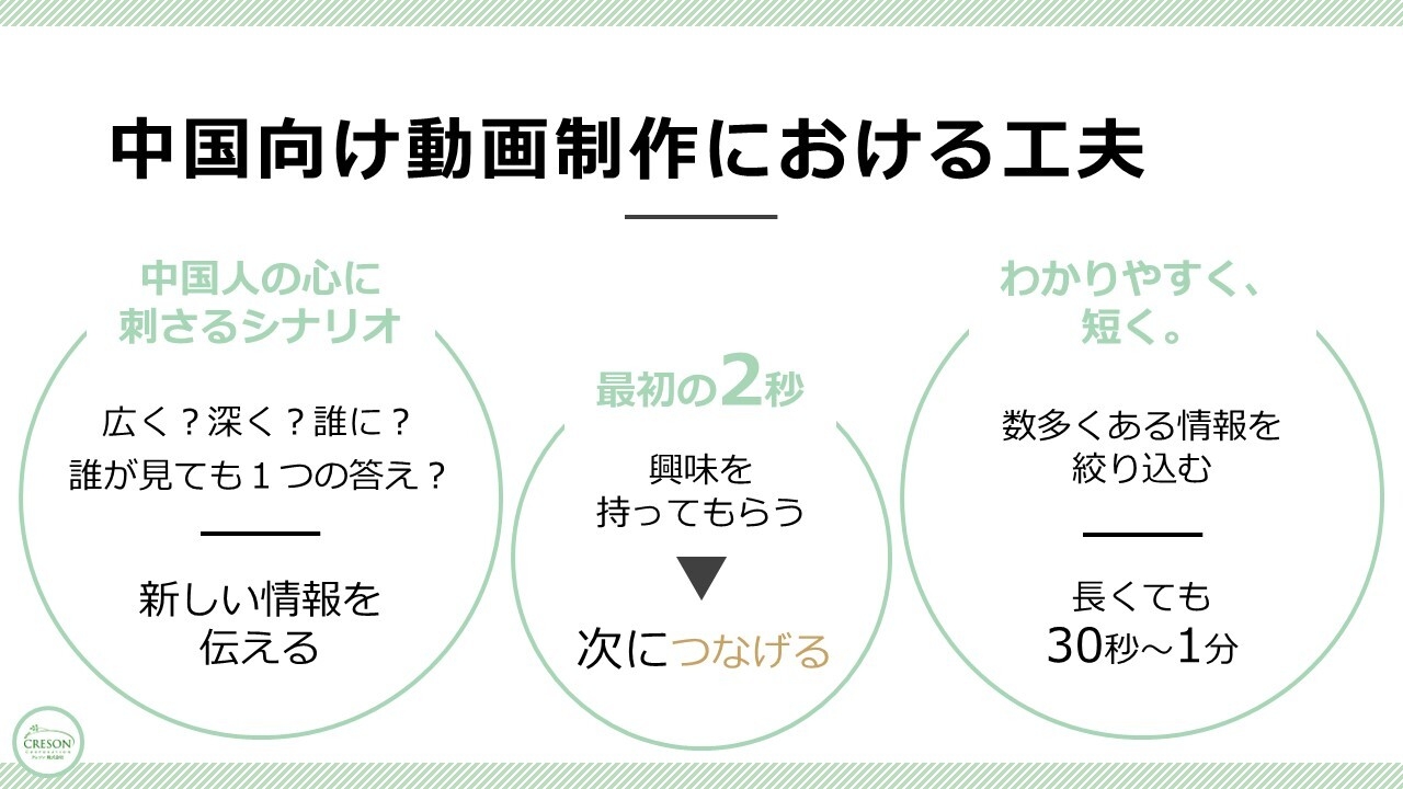 この背景を受けて、クレソン株式会社は、中国語のショート動画の企画制作と、中国SNSアカウントの運営ノウハウを活用し、日本語動画を中国語に編集して配信するサービスをスタートします。