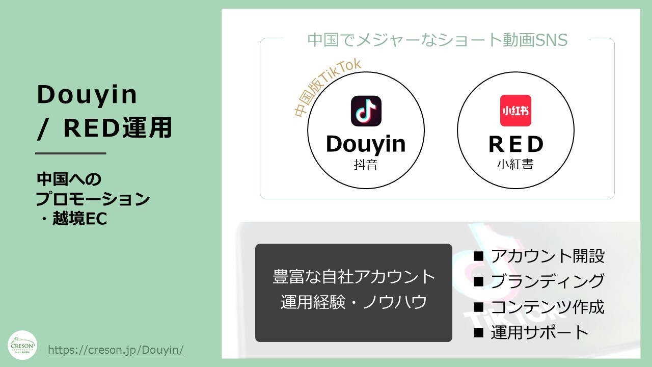 2021年より自社で中国版TikTok抖音(Douyin)や小紅書(RED)アカウントを複数運用開始し、これまで培ってきた抖音・小紅書の運用ノウハウを活用し、2022年4月より抖音・小紅書の運用代行サービス及び中国向けショート動画の制作・編集サービスを開始。