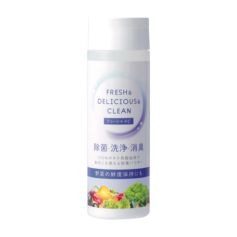 従来品の「フレ・シャス」からリニューアルした「フレ・シャスC」は、北海道オホーツク海産のホタテ貝殻を100%使用し、その貝殻を高温処理した焼成カルシウムです。焼成カルシウムは、食品添加物としても使用されており「フレ・シャスC」は、安心安全な除菌・洗浄・鮮度保持剤です。水に溶かしてつけ置くだけで、汚れや腐敗を進行させる農薬や有害汚染物質、細菌類を除去し、食材本来のおいしさを取り戻して、さらに鮮度を保ちます。なお、「フレ・シャスC」は、フレッシュ、デリシャス、クリーン(CLEAN)を掛け合わせた造語です。