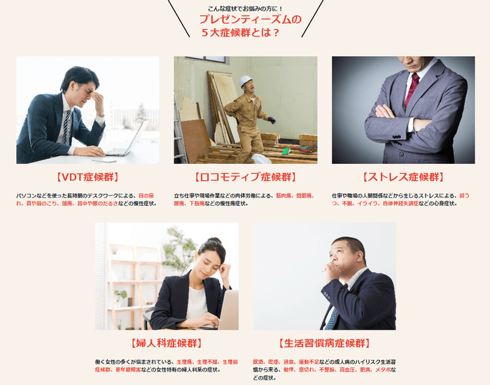 同サイトは、全国に2万社以上ある健康経営優良法人を対象に、社員の5つのプレゼンティーズム症候群(VDT症候群、ロコモティブ症候群、ストレス症候群、婦人科症候群、生活習慣病症候群)に対応する東洋医療&手技療法(鍼灸、マッサージ、整骨、整体など)の治療院をマッチングするもので、全国初のビジネスモデルとなる。