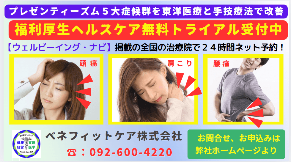 健康経営企業のプレゼンティーズムに対応する東洋医療&手技療法の治療院を検索。