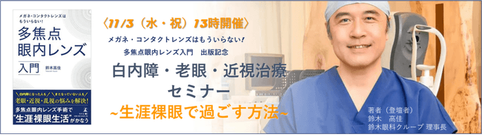 【セミナー申し込み受付中】『白内障・老眼・近視治療セミナー~生涯裸眼で過ごす方法~』11月3日(水・祝)開催