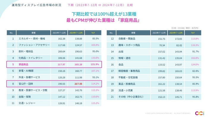 今回の調査からCPMの業種別比較表を追加しており、2024年上期と比べて100%を超える業種が13業種に達した。