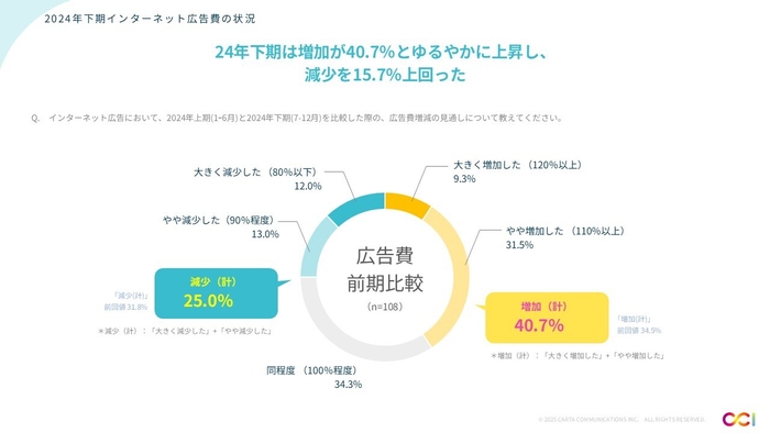 2024年下期の広告費は、2024年上期と比べ増加したとの回答が40.7%で、前回調査時より6.2%増加。前回は「増加」・「同程度」・「減少」の割合がほぼ同水準であったが、2024年下期は「増加」の割合が増えており、広告費が増加傾向にあることがうかがえる。