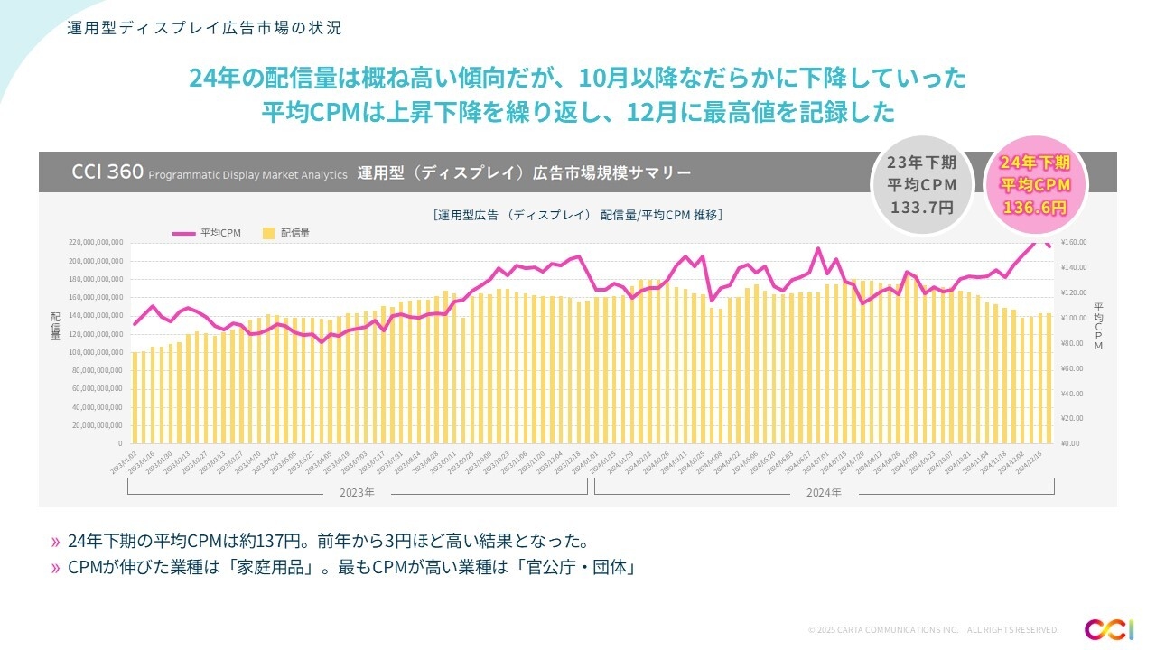 2023年と比較して2024年のCPMは高い傾向を示し、上昇と下降を繰り返しながら、2024年12月に最高値を記録し、2024年下期の平均CPMが136.6円となった。