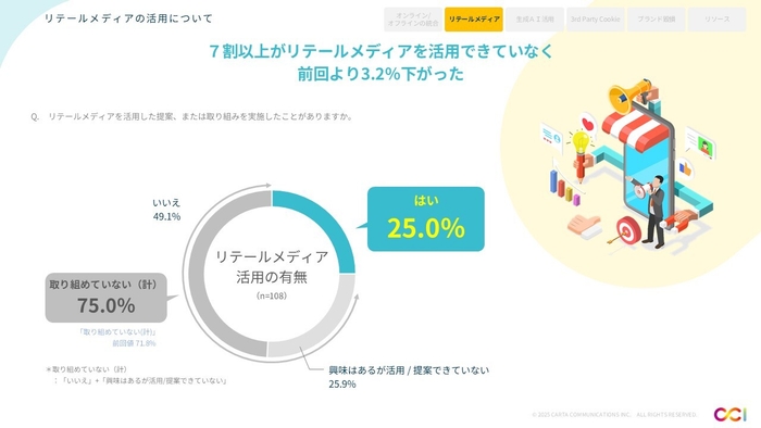 リテールメディアは興味関心が高く、注目されている取引手法だが、現状では活用率が低く、まだ活用できる余地があることがわかった。