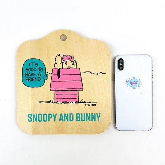 こちら、使わない時はフックなどに吊るしておける木製の鍋敷きなんです。ほっこりするようなスヌーピーのイラストがカワイイ♡