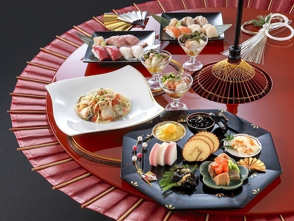 ※12月31日(火)~2025年1月3日(金)は、シェフ特製 蝦夷鮑のペペロンチーノや握り寿司のグレードアップなど限定メニューが登場。(大人料金は、上記プラス1,000円)